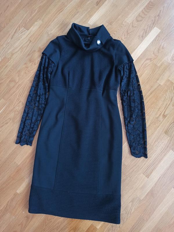 Весняне тепло плаття з коміром, трикотажне. Рукави повністю з гіпюру. Гарно лягає по фігурі. Заміри ПОГ 44см, довжина 100см, рукав 64см.