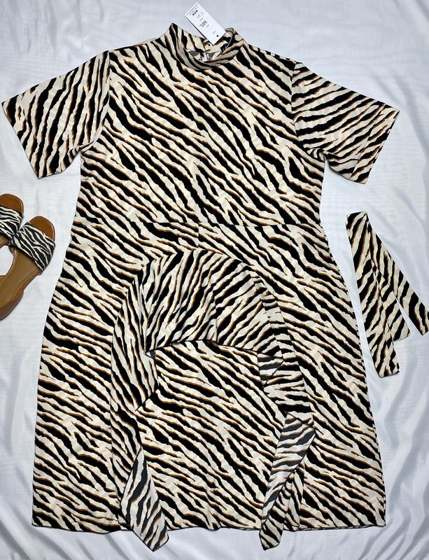 Нове плаття в анімалістичний принт. Рр. М-L Заміри : Довжина 115 Плечі 44 Рукав 27 Пог 60 Піт 60 Горловина стійка. Ззаду застібається на один гудзик. Попереду вшитий волан. При ходьбі, красивий,повітряний ефект. Дуже приємне до тіла. Не просвічується. Для паска ,з обох сторін шлевкі. Відповім на ваші питання . Накладеним - передоплата.