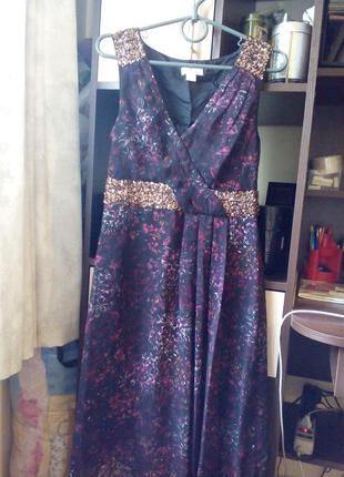 Дуже красиве плаття. Легеньке. Як нове. Вдягнула 1 раз,хоче більші грудей( у мене 34). Красивий бордовий орнамент. Талія і плечі обшиті паєтками. Заміри довжина 96 см,під пахами 38(збоку замочок),талія 35 див. Знизу накладається одне на одного. Шикарне.