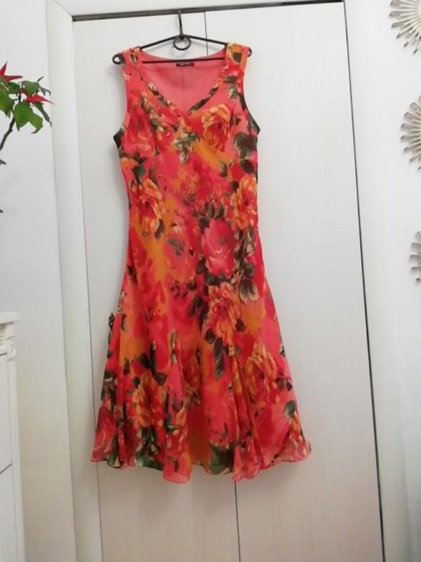 Дуже красиве, яскраве, легку сукню. Розм. 40-42. На підкладці. Орієнтир. на заміри дл. 1.18, ПОГ 55-56,чашечки присобрана, косою по косій. Збоку блискавка.