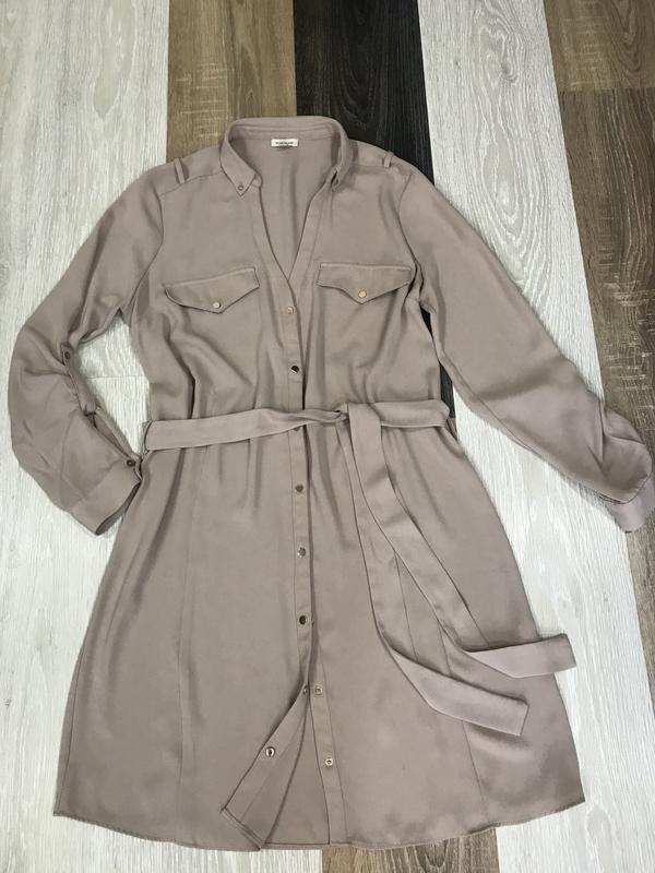 Платье-халат в пудренном цвете под пояс с фурнитурой в золотистом цвете.Ди 93, ог 48, от 48, об 50, дл рук 58