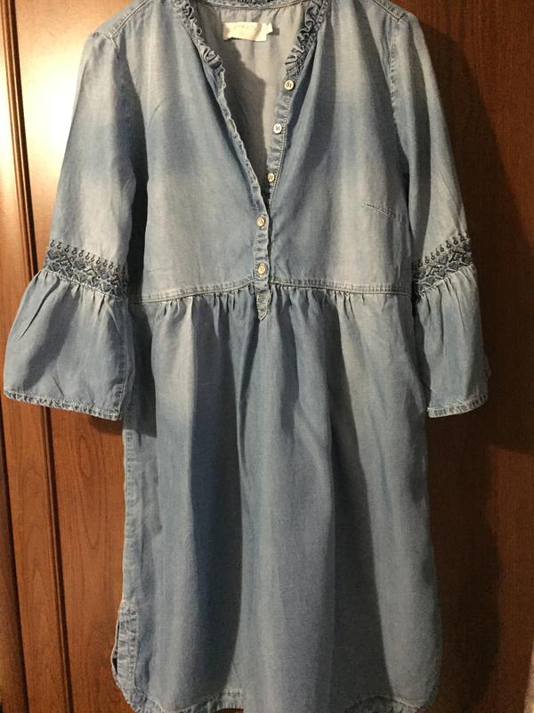 Сукня вільного силуету з тонкої джинсової тканини. Рукава оздоблені вишивкою. Довжина 90-91, плечі 37, пахви 46, піт 44, побіди 57
