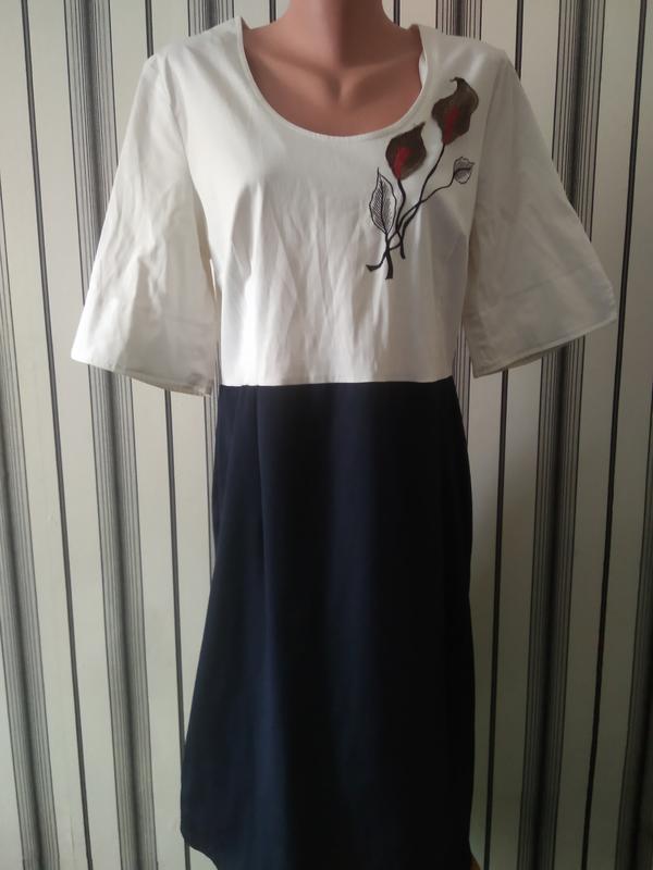 Сукню вбрана два рази. Верх із щільної коттоновой тканини, низ -з еластичної костюмної. Ззаду замок, рукав до ліктя. На грудях аплікація.