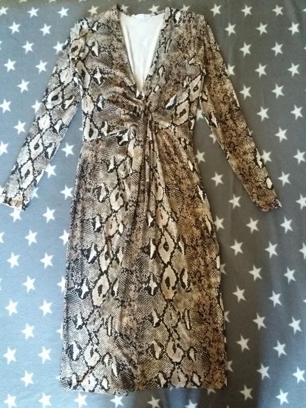 Відчуйте себе хижачкою в міських джунглях.Принт -рептилія.Легке міді сукня з довгим рукавом і глибоким вирізом від відомого бренду.