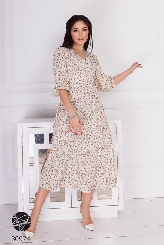 Платье миди с плиссированной юбкой. V-образный вырез, рукава три четверти со сборками на плечах, боковые карманы. Сзади застёжка на потайную молнию.