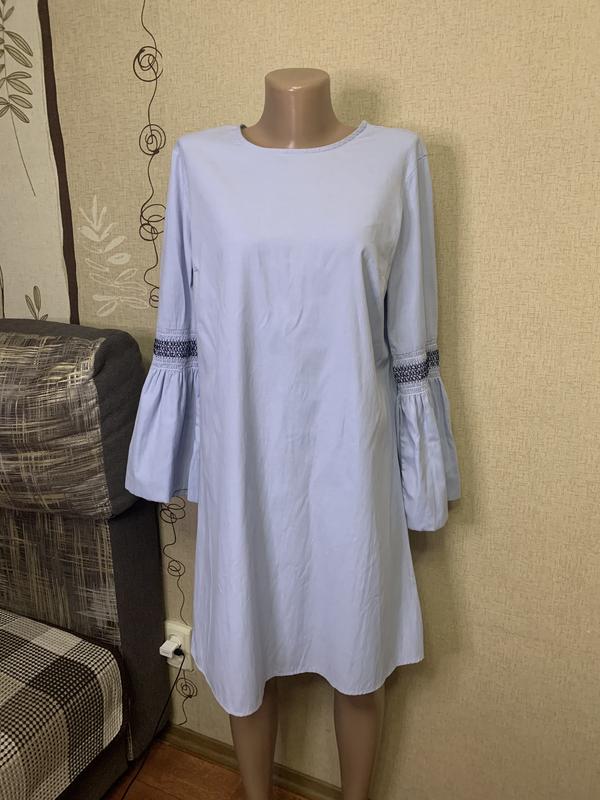 Довжина 90, напівобхват під пахвами 51, на рукавах красива жатка і візерунок. Небесно блакитного кольору, стан нового.