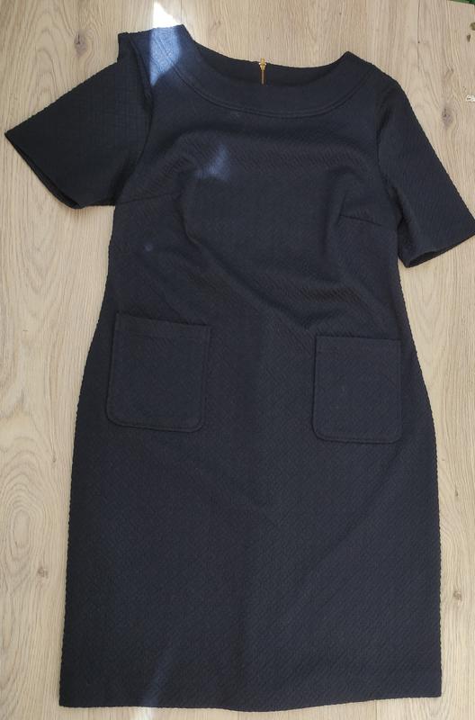 Комфортное платье от TU р. 16 состав 98% полиэстер,2% эластан Очень приятная ткань- не отягивается, не сминается. Отлично держит форму. Приятный темно-синий цвет с жаккардовым теснением. Замеры: длина по спинке- 94см, ширина на уровне подмышек 50см ,талія 49 см Бедра-54см.
