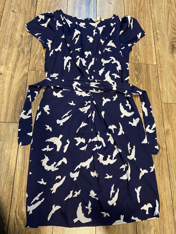 Красивое платье, яркое и с принтом-птицы. Платье хорошо носится, удобное, в хорошем состоянии, есть затяжка не большая (есть на фото). Размер написан М, но идёт на S. Обращайтесь, отвечу на все вопросы.