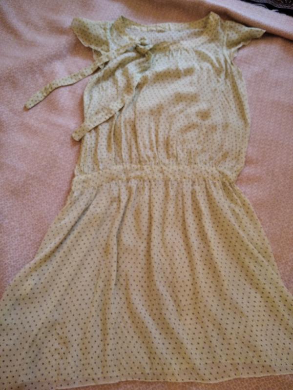 цвет яблочный в мелкий горошек, на вырезе горловины завязки, талия занижена, на фото цвет искажает, очень легкое
