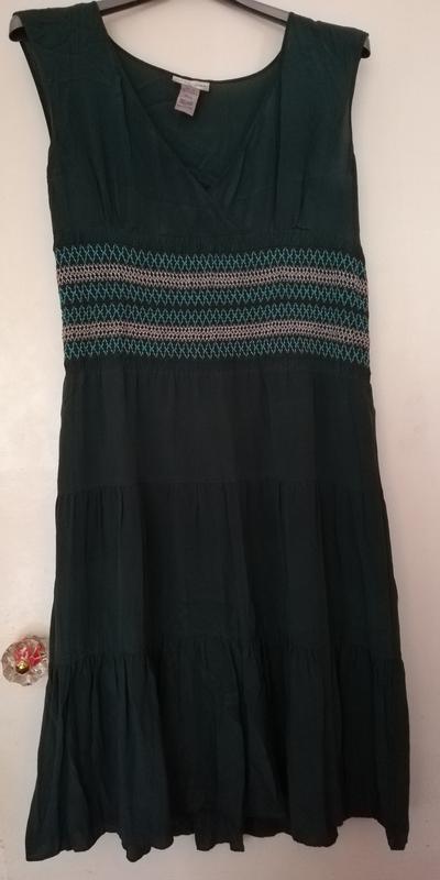 100% шовк.Легке і невагоме. Є сліди носіння у бокових(видно тільки на просвіт). Можна відрізати верх і зробити чудову спідницю. Довжина 105 см Пог 40/45 см пот 42 +( на талії резинка) побіди до 60 см є нижня спідниця. Колір насичений темно-зелений