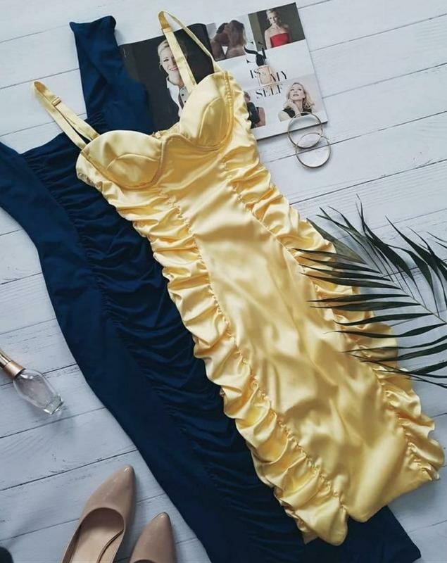 Дуже красиве атласне плаття жовтого кольору, з чашечками, з боків прикрашена сборочкой. Матеріал тягнеться. Сукня абсолютно новий, але без бірки Розмір 8. Напівобхват грудей - 34 див. Напівобхват талії - 26 див. Напівобхват стегон - 39 див Довжина - 93 див.