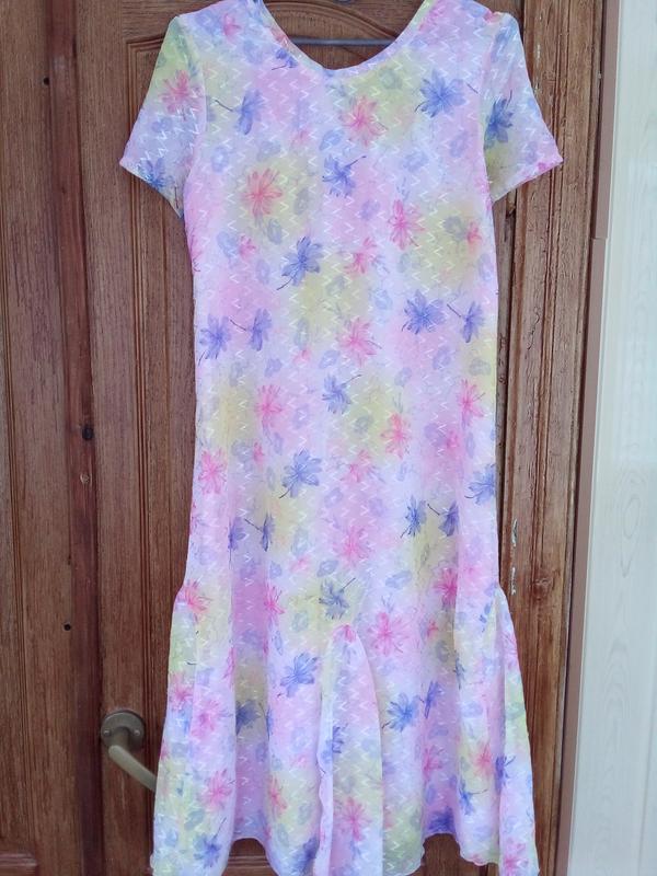 плаття з підкладкою, знизу зі вставками, ззаду зав'обов'язками, вільного крою, розмір 44-48, ОГ 90 см, ВІД 88 см, довжина 104 см