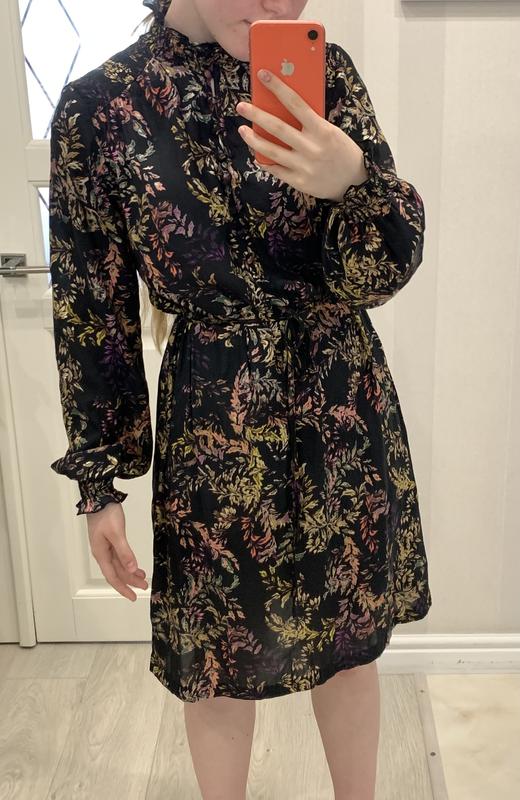 Сукня вільна,розмір можна відрегулювати за допомогою пояса до неї. Легка і елегантна. Довжина-93 см, талія-54 см, груди-53 см, довжина рукавів від плеча-62 см, вільного крою. Підійде як на XS,так і на М. Одягала від сили один раз, в ідеальному стані.