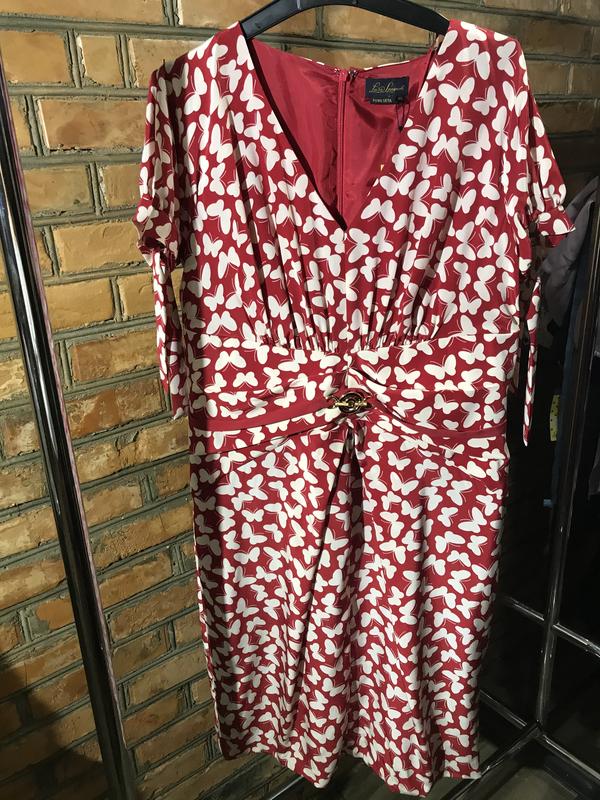 Платье с коротким рукавом с красивым классическим историческим принтом на красном фоне белые бабочки. Вырез V образный. Отрезное по талии. Пояс с закладками из ткани с красным шёлковым поясом с пряжкой цвета золота. Юбка прямого кроя. Рукав фонарик на завязках. Не отрезной! Сзади скрытая молния и крючок. На подкладке. Тонкое и прохладное. Очень приятное к телу. Шикарно облегает фигуру. Платье для богини! Размеры: ПОГ 52 см ПОТ 45 см Длинна по спинке 107 см Длинна рукава от воротника 28 см