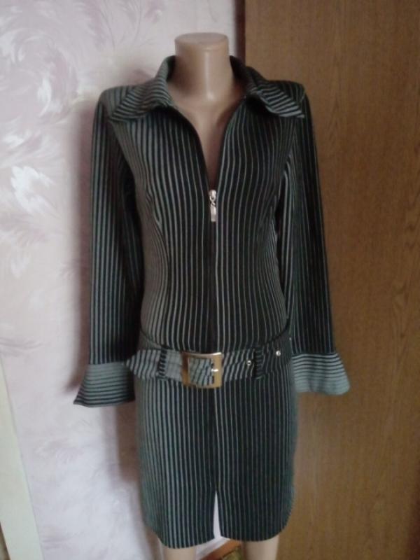 Строга сукня з цікавим переходом від світло-сірого до майже чорного кольору смуг доповнить ваш гардероб речей для ділових зустрічей і не тільки.