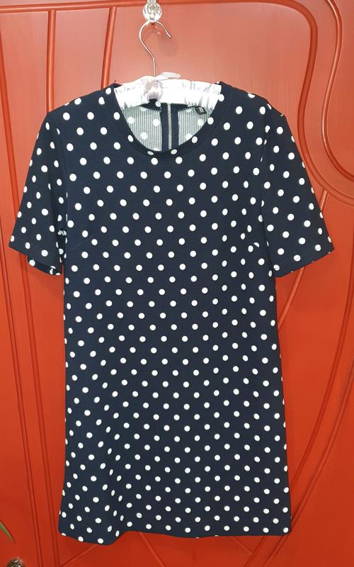 Симпатичне платтячко в горох, розмір вказаний 12, в ідеальному стані. Сукня рівного крою, ззаду на блискавці, тканина тягнеться. ПОГ - 45см, ПОТ - 45см, ПОБІДИ - 46,5 см, довжина - 87см. Якщо потрібні додаткові фото та заміри - пишіть в повідомленнях.