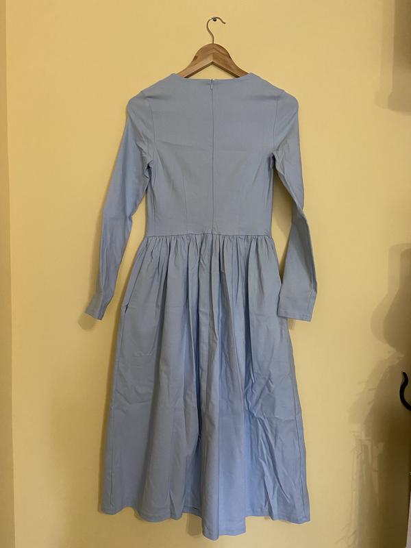Нове плаття, збереглися бирки. Не одягалось. Є кишені. Вільна талія. Сукня тягнеться до грудей. На талії резинка. ПІТ 35 см за рівнем гумки ПОГ 39 см Довжина 116 см S/М розмір