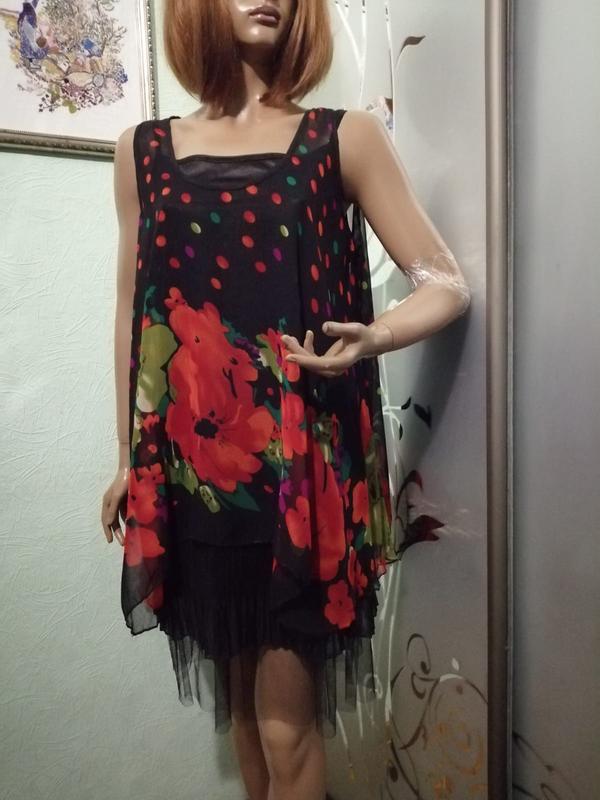 Платье состоит из двух частей, нижнее, на бретелях, низ гофре и сетка, верхнее шифоновое, ассиметричное Замеры по нижнему платью пог 54,пот 57,поб 58,длина 96,длина верхнего 80/85 Размер л