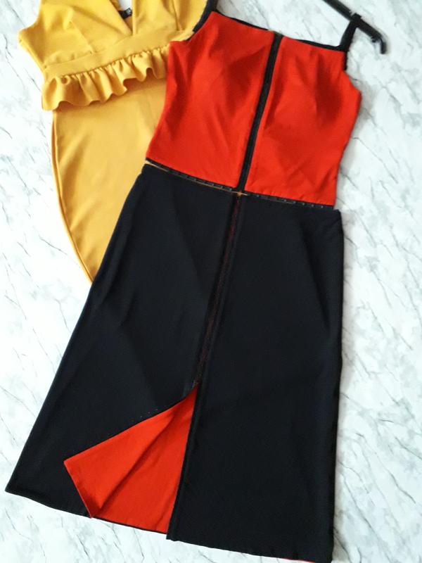 Стильный трендовый костюм,платье на крючках.Цвет черный,красный(классический,без оттенков).Ткань - мягкий трикотаж,тянется. В майке есть вкладыши для груди. Костюм двойной,двухстороний. Можно подбирать разное цветовое сочетание. Эффектно смотрится. Замеры в спокойном состоянии: Майка Пог 41 По низа 39 Высота по боковому шву 24 Юбка Пот 40 Поб 51 Высота 67 Котоновый трикотаж. Италия. Обмена и возврата нет!Оплата 100% на карту Приват.Всем отличных покупок! Укрпочта,Новая почта.