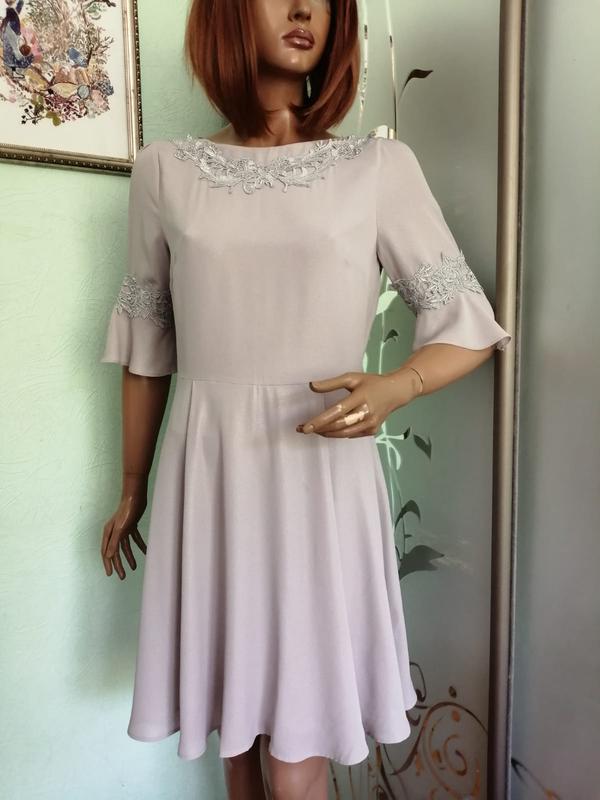 Розмір 12,46,м Пог 48,піт 39,побіди на підкладці 59,по верху ще вільніше, дл рук 37,дл пл до талії 41,загальна від плеча 94 Плаття сіро-бежевого кольору, тканина з благородним переливом, на підкладці