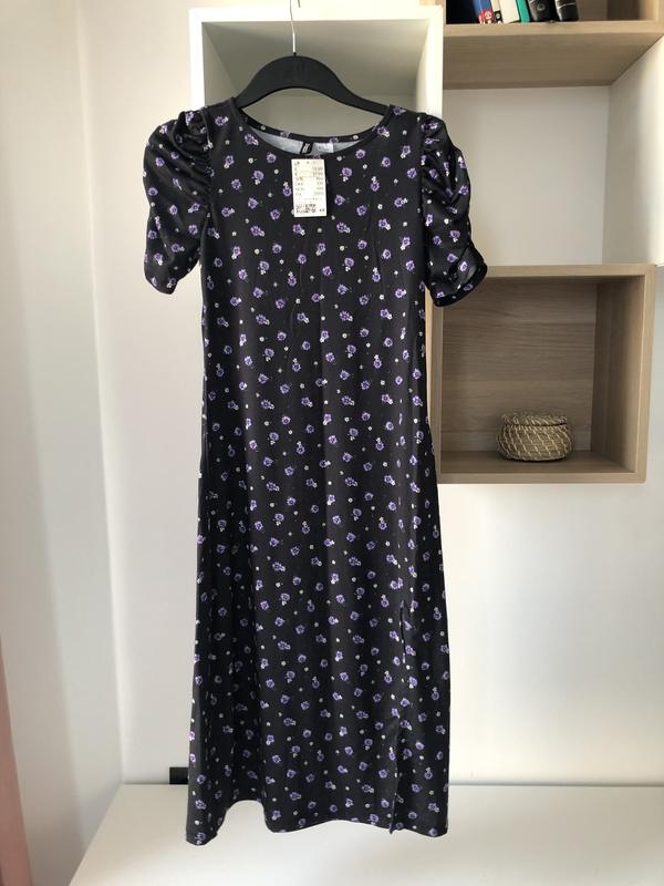 Сукня довжиною до коліна з трикотажу з малюнком. Круглий виріз горловини, короткі рукави-ліхтарики на гумці і розріз спереду. СоставПолиэстер 97%, Еластан 3%