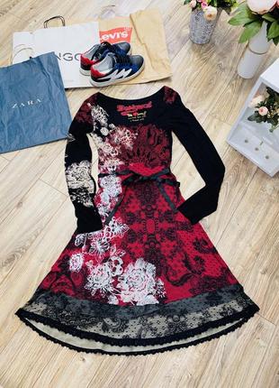 Шикарное платье от Desigual🤩. Очень интересный цветочный принт, внизу платья два крупных цветка как набивные, старалась максимально передать на фото, что даёт эффект 3D. Талию подчёркивает тоненький поясок, лого бренда сзади на спинке вышито красивой золотистой нитью. Замеры Длина 96см ПОТ 31см Бёдра свободные Рукав 65см ПОГ 39см Ткань хорошо тянется, замеры сняты в спокойном состоянии.