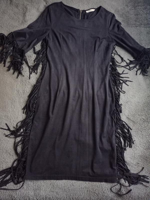 плаття 42 розміру, тканина мокрій замш, на рукавах і по боках пришита бахрама, нове. колір насичений чорний фото не передає.