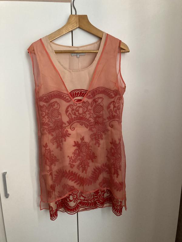 Ошатне плаття з вишивкою. Двошарове. Шовк. Чохол коралового кольору з органзи. Пог 45 Піт 40 Побіди 45 Довжина по спинці 85