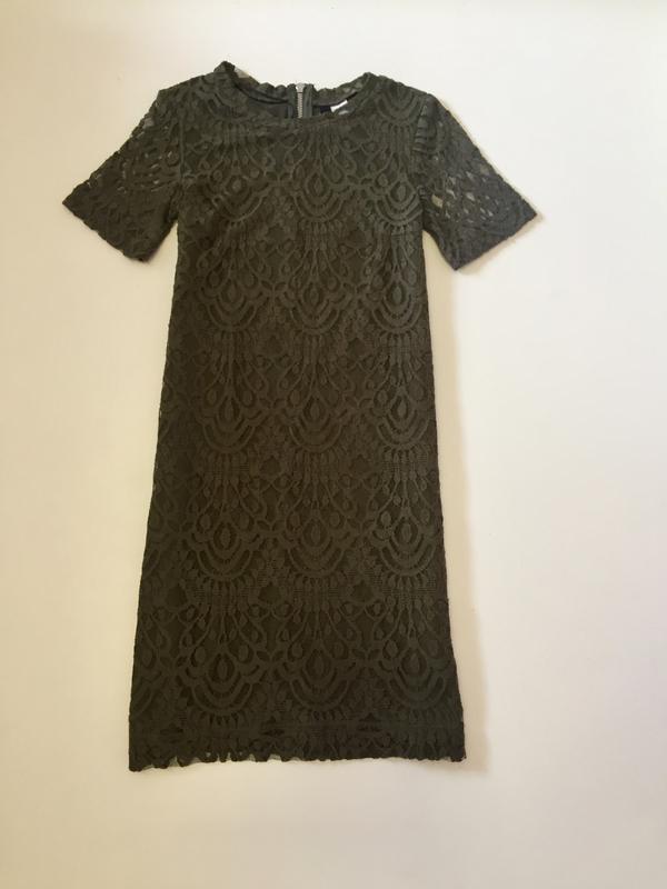 Гіпюрову плаття на підкладці, колір хакі, рівна крій, без відрізний талії Довжина 78, пог 36, піт 36, побіди 39, плече 7, довжина рукава 19