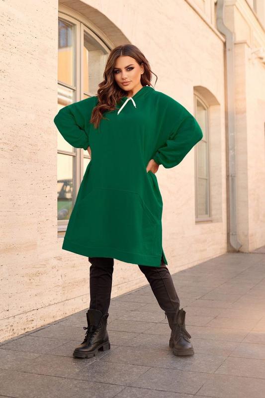 Платье-туника Арт 5558 Цена 670 грн Материал: трехнить-петля, турецкая, хлопковая. Плотная , слабая растяжимость. Длина 97 см, по бокам разрезы. Капюшон. Длина рукава 61 см. Замеры по изделию: ОГи ОБ 135 см . Стиль оверсайз Размер универсальный 46-64