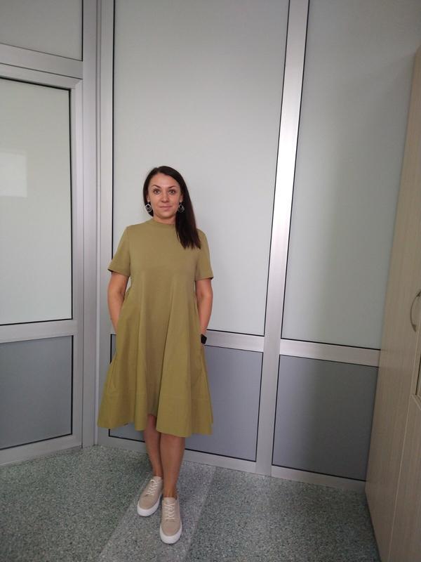 Красиве, модне плаття. Тканина верх-щільний трикотаж, низ-щільний бавовна! Колір-оливка, хакі. Ззаду трохи довше, розмір М-Л ( на бірці вказаний М, але можна і на трохи більший розмір). Заміри: Плече-10 см, рукав-22 см, груди-46 - всі ці виміри в спокійному стані, але тканина ще тягнеться. Довжина - спереду 98 см, ззаду -103см.