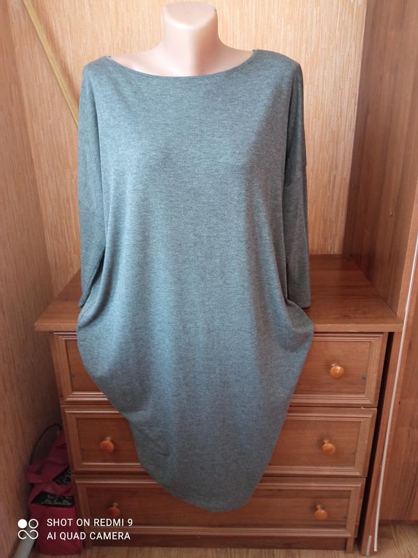 Сукня імпортне сірого кольору. Дуже приємне к тілу. Довжина з одного боку 93см, з другого 103 см (воно асиметричне) Плечі спущені Ширина плаття 65см (ПОГ) Рукав від горловини 55см