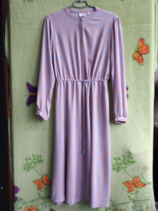 Красивое платье миди в винтажном стиле от модного датского бренда Vila. Платье отрезное по талии, спереди скрытая застежка на пуговицах. На талии стягивается пояском. Милый цветочный желто-пудровый принт на небесно-синем фоне. Бирка со составом срезана, но могу точно утверждать, что 100% вискоза. Размер указан 40 евр. Мои замеры: ШП-40 ПОГ-52 ПОТ-55 ПОБ-62 ПОН-80 ДР по нижнему шву-47 от плеча-64 Дл по спинке-118 см. Стан идеально