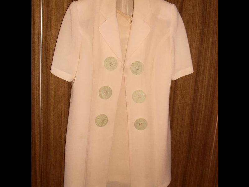 Красивый стильный костюмчик светло-желтого цвета с необычными пуговицами. Длина - по колено. Платье на подкладке, фигурный вырез ворота. Сзади замочек.Размер 48-50. Смотрите и по меркам: полуобхват груди 46см, полуобхват талии 44см, полуобхват бедер 52см, длина изделия 83см. В очень хорошем состоянии. обратите внимание цена указана без упаковки