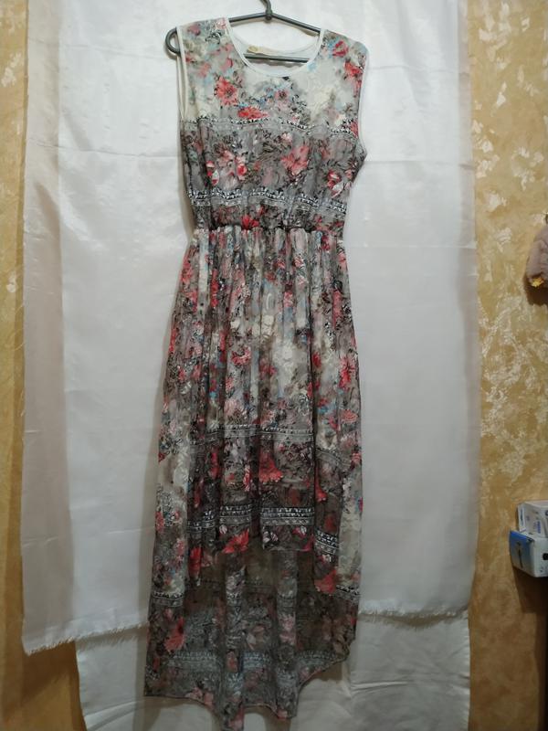 Гарне плаття, виконане з гіпюру з квітковим принтом. Передня частина спідниці по коліна, а задня більш довга...приблизно до середини ікри (у мене зріст 173 см) Заміри: Півобхват грудей - 48 см Півобхват талії (місце, де вшита резинка): в спокійному стані - 30 см, в розтягнутому - 48 см Довжина по спинці від плечового шва до талії - 42 см