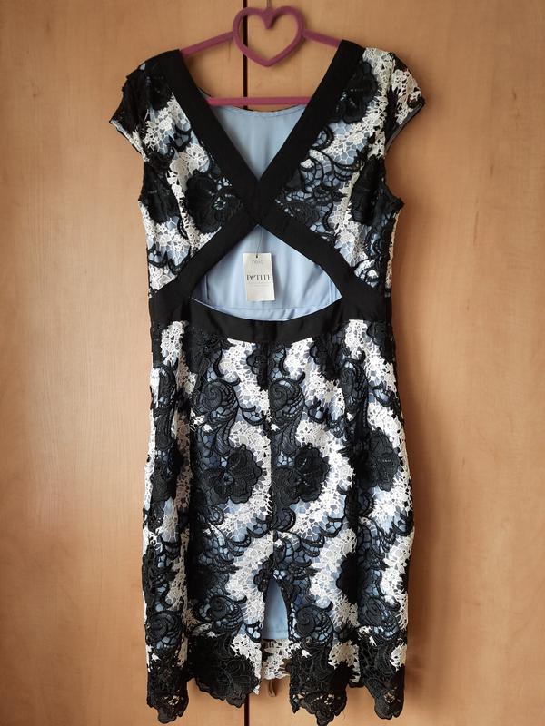 Ошатне мереживну сукню відомого бренду NEXT. Верх чорно-біле мереживо, підклад ніжно блакитний. Довжина 100, груди і стегна 100 см, талія 80. Бічна блискавка. Відмінний варіант для новорічних свят.