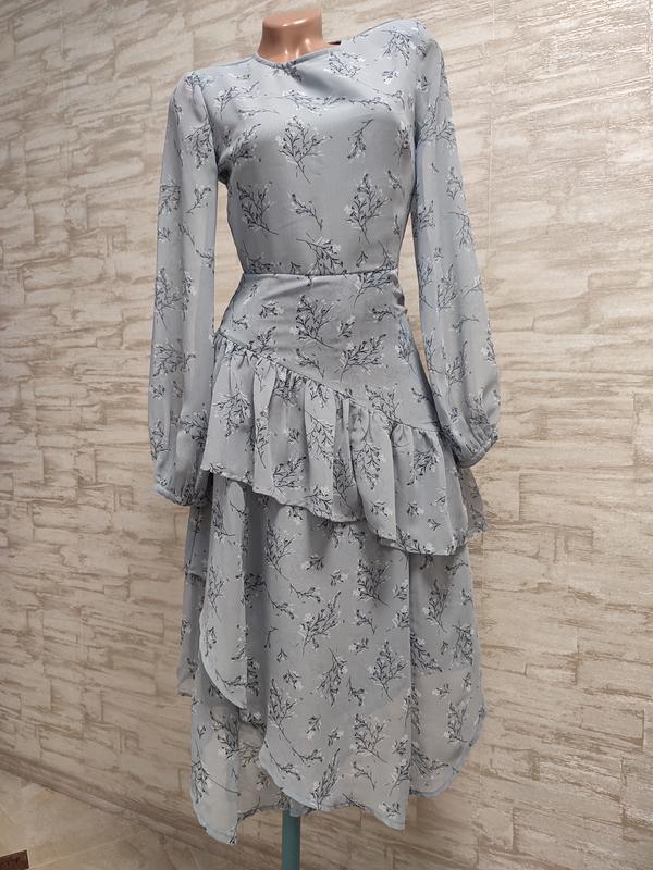 Ошатна сіро-блакитна сукня в квітковий принт бренду WAREHOUSE Приталене , на спинці потайна блискавка, об'ємний рукав , спідниця з оборкою. В ідеальному стані! Склад: 100 % поліестер крепдешин, всередині підкладка. Розмір вказано UK 8, орієнтуйтеся на заміри. максимальна довжина переду від плеча - 121 см, довжина від плеча до талії - 40,4 см ПОГ - 41 см ПОТ - 32 см довжина плеча - 10 см довжина рукава - 60 см ширина в плечах - 37,5 см