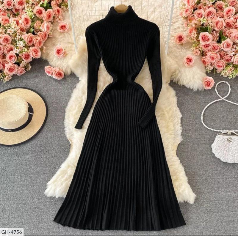 Сукня GH-4756 Розміри: 42-46 Колір чорний. сірий. коричневий. малиновий. пудра. бірюза. т. беж. білий.. Такі жіночні сукні з високим горлом (фабричний китай Тканина щільний трикотаж рубчик, спідниця плісировка Довжина 114 см рукав 57 см 8 кольорів ----------------------------------------