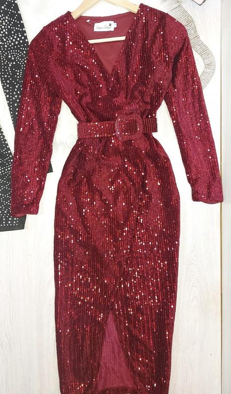 Нереальне винне сукню, обсипану паєтками, з трендовим пояском, виділяє талію. Всередині на двох кнопках, відмінно держут! Розмір S Заміри: ПОГ 40-47 ПОТ до 37, менше - регулюється пояском він робочий, не декоративний ПОБІДИ 40-47, за рахунок запаху Довжина 115 В цьому платті немає шансів залишитися непоміченою!