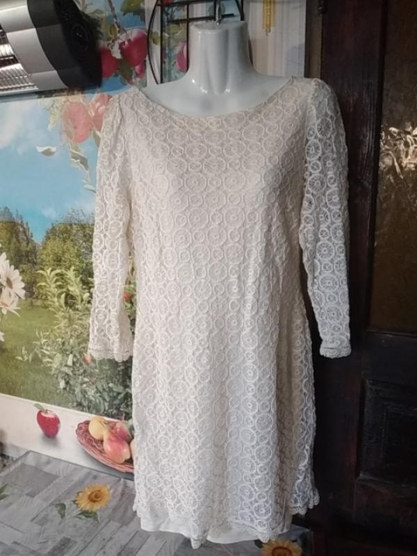 Мереживне світло-бежеве,всередині підкладка.Ззаду на прихованій блискавки.Довжина-83,ог-41,від-42