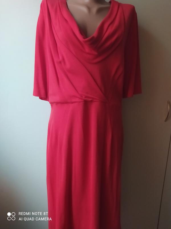 Платье алого цвета ,рукав до локтя,3/4, На хорошую грудь.Ткань мягкая ,трикотаж.Длина - на пол икры. Сзади закрытая строгая шлица. Очень красивое платье, фасон. Трудно сфоткать , т к манекен в 2-3 раза меньше платья и невозможно показать красивый богатый ворот, складки ,защипы на поясе.