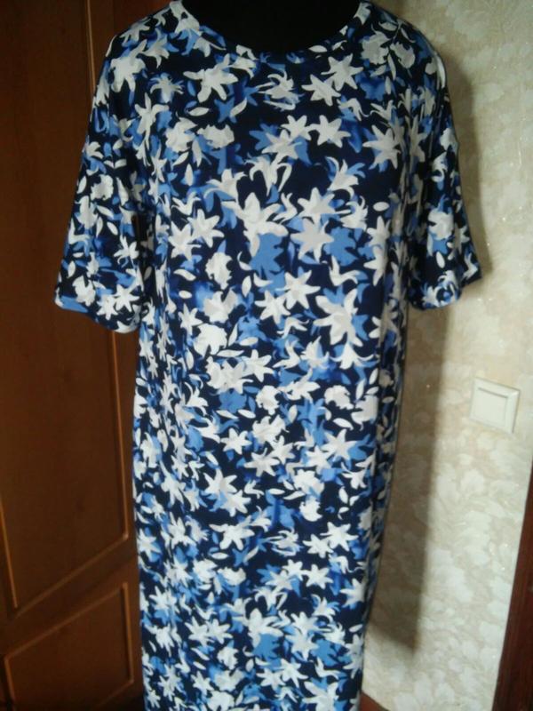 тканина натуральна дихаюча Довжина 120 см ПОГ 67-68см+++і ПОБІДИ вільно до 71 +см(тканина відмінно тягнеться) Довжина рукава від горловини 46см(закриває лікоть)-можна піднімати Фасон вільний прямий,кишеня справа в шві Тканина м'яка і еластична-благородний найвищої якості футболочный трикотаж.Якість тканини дозволяє носити в сильну спеку.Тканина не линяє і не сідає,не просвічується.не сильно мнеться стильні принти на темно-синьому тлі Забарвлення м'яка яскрава ненав'язлива і до будь-якого випадку до місця Сукня може і на розміри менше-буде спадати фалдами-не настовбурчується Склад:95 віскоза 5%еластан, віскозний благородний трикотаж,відмінно тягнеться,середньої щільності Всі виміри в спок.упоряд. Декольте помірне.можна носити в сильну спеку.з-за довжини рукава можна одягнути і весна-осінь Відмінно виглядає під кросівки і джинсовку як спортшик....Все краде по фігурі