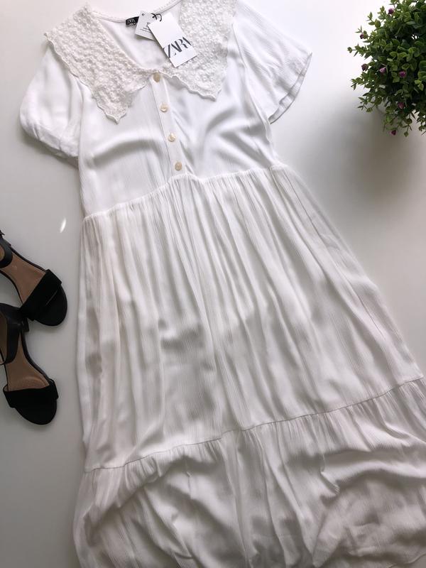 Сукня Zara (біла) Нова з біркою Склад 100 віскоза / 100 поліестер Розмір XS Довжина 133, плечі 34, рукав 22, пог 50 тягнеться 56, пот 46 тягнеться 52, поб 53 тягнеться 89, довжина до талії 45, Подклада поб 56 тягнеться 73 Розмір L Довжина 121, поечі 41, рукав 22, пог 56 тягнеться 64, пот 53 тягнеться 58, поб 58 тягнеться 95, довжина до талії 47, Подклада поб 63 тягнеться 80