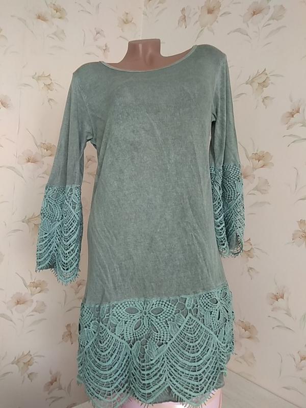 Шикарное итальянское платье. Красивое широкое кружево на рукавах и спереди по низу платья придает элегантности и нежности. В плечах 40 см. Длина рукава от плеча 48 см. ПОГ 46 см, прямого силуэта. Длина 82 см. Ткань лёгкая ,нежная, слегка тянется. Прекрасно ложится по фигуре. Нежный пастельный цвет - зеленоватосерый с бирюзовым оттенком, ближе к оригиналу на первых фото. Эффект "варенки" . Состояние идеальное. Следы носки отсутствуют. Дефектов нет.
