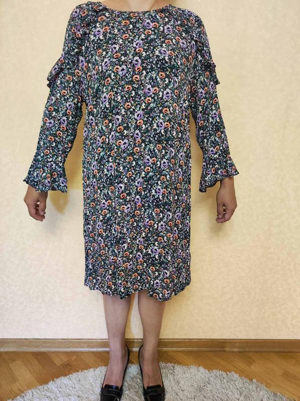 Очень красивое качественное, прекрасно маскирует проблемные места .Платье из 100% вискозы.Цветочный принт,прямой покрой,рукав приспущен. пог 55см поб 60 см длина по спинке 90 см длина рукава от горловины 60 см точный цвет как на 1 фото