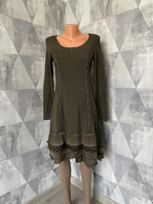 Фото на тілі немає Фото на маникене Унікальне плаття дизайнерського фасону Рукави довгі круглий Комір на ньому гудзички дэкор Фасон по фігурі Візуально тягне фігуру Знизу рюшки Тягнеться ,середня Щільність Підійде на с м європейський орієнтуйтеся по замірах Довжина 94 см) Плечі 37 см, Рукав-61 см) Пог 45,5 см) Піт 38 см) Поб 53 см) Знизу 66 см) Продається так як є без притензій і без повернення)