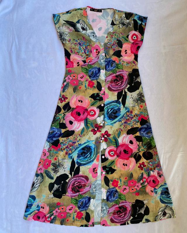 Невагома сукня в квітковий принт. Попереду на ґудзиках. Вся фурнітура на місці. Під грудьми гарний декоративний шов. Розмір S Довжина 116 см
