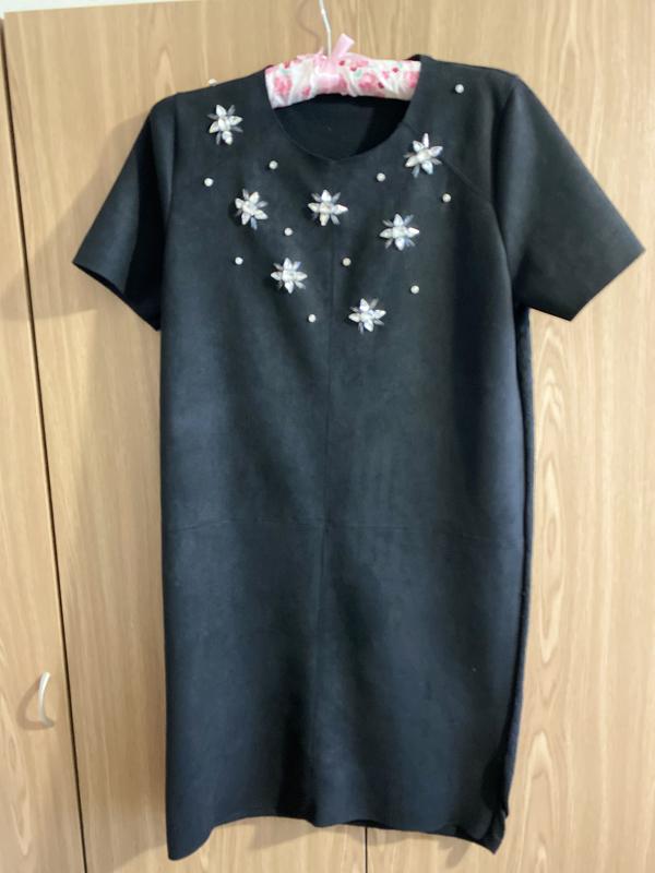 Гарне чорне плаття. Спереду прикрашене (всі стрази добре прошиті). Матеріал - спереду штучна замша