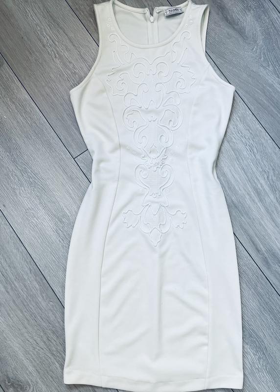 Очень красивое платье из плотной ткани, не просвечивает, тянется и хорошо держит форму. За счет фактурного узора можно носить без бра, скрывает все, что должно быть скрыто от посторонних глаз, хорошо утягивает и сглаживает силуэт Молочного цвета