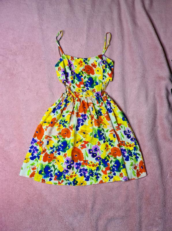 Продам квіткове плаття з відкритими боками. Виглядає красиво. У відмінному стані. Тканина легка, не просвічується. Розмір S, невелика M.